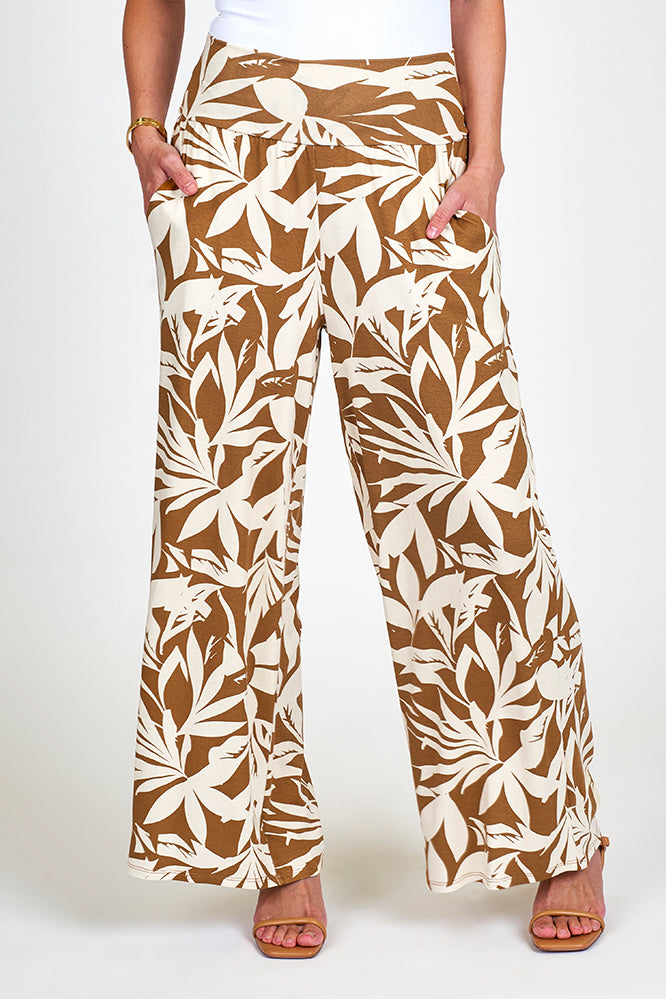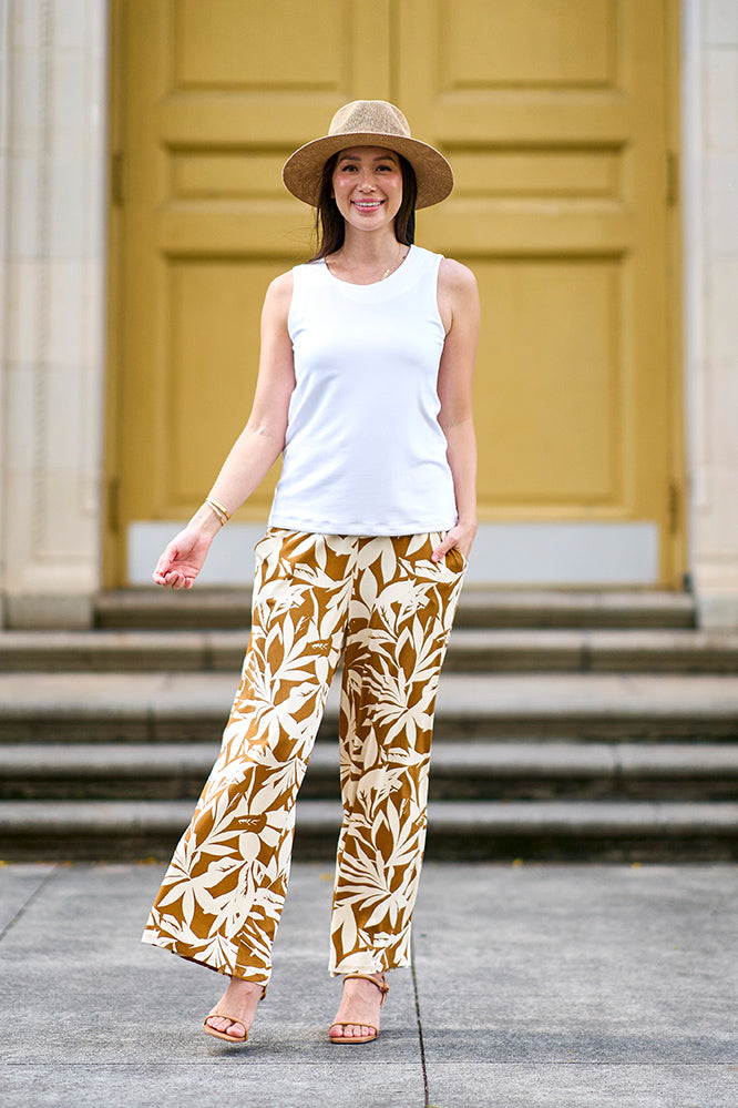 Bask in golden hour strolls with our Wide Leg Ankle Pant in a warm amber shade. Featuring our beloved modern tropics print, this versatile pant effortlessly transitions from relaxed weekends to chic date nights. With a flattering wide waistband and trendy wide-leg design, it’s a must-have addition to your wardrobe you’ll reach for again and again!