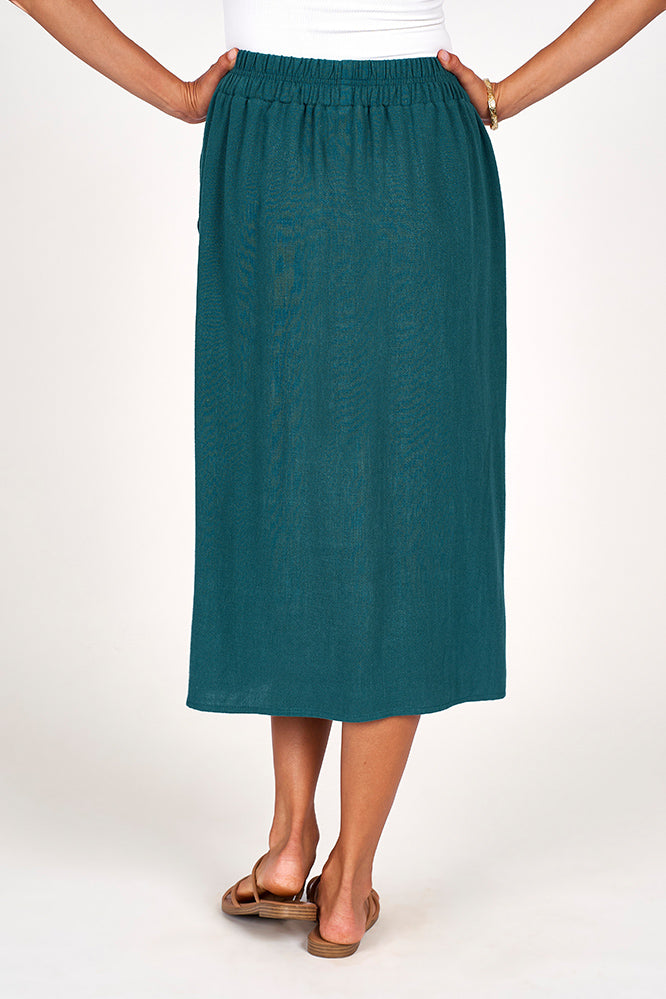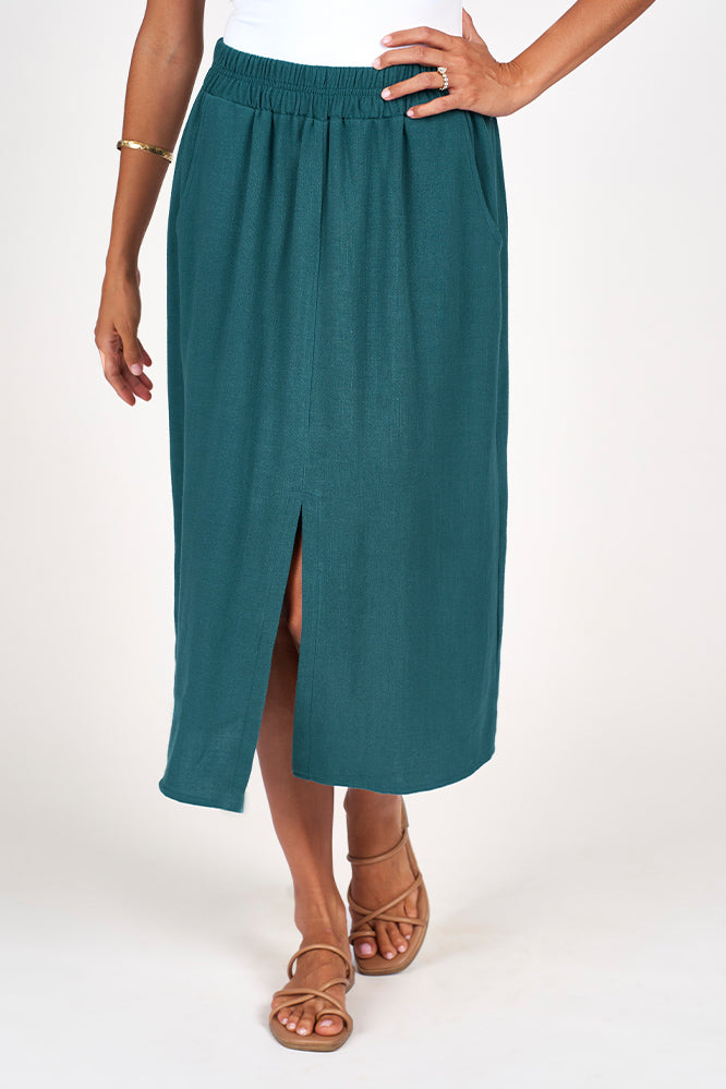 Step into easygoing elegance with our Oceanside woven skirt. Made from a soft rayon linen blend, it feels silky on your skin and offers a light, flowing shape that moves effortlessly with you. The elastic waistband provides extra comfort and support, while the front slit adds a fun, flirty detail. Pair it with your favorite top for a lively, confident look that’s perfect for all your sunny day adventures.