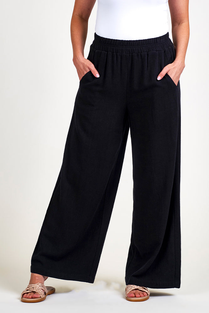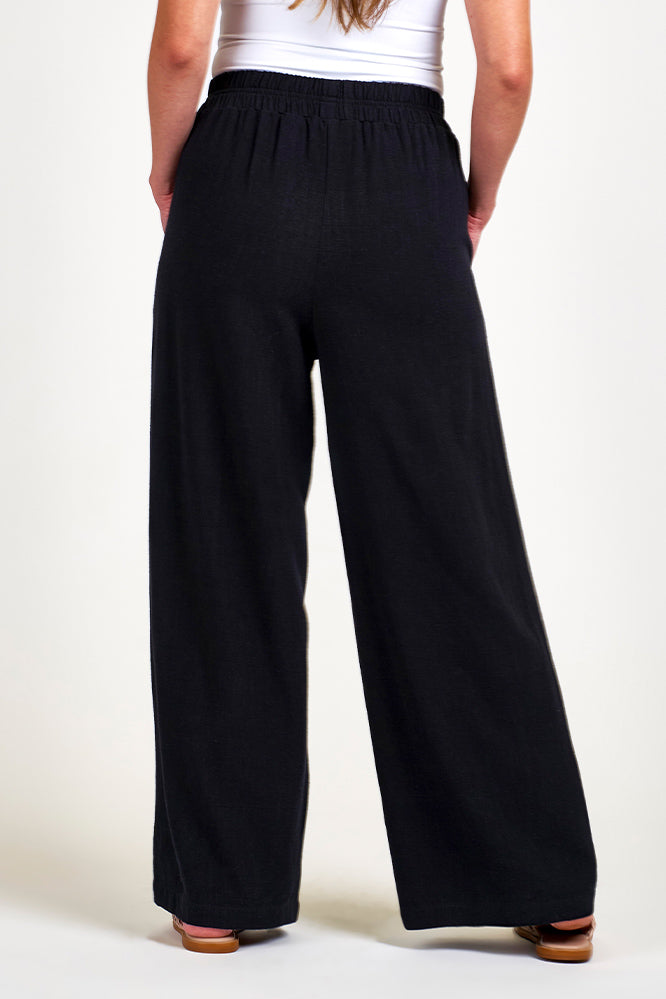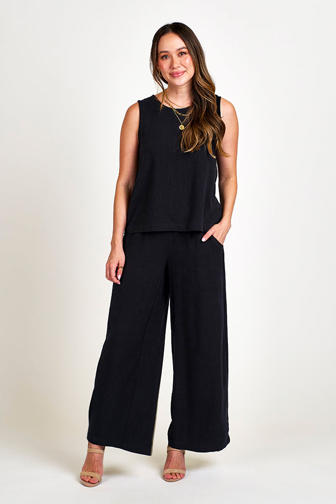 Anything but basic! This wide leg pant drapes nicely and can easily dress up or down. A timeless piece that provides timeless style and comfort. Experience the luxurious drape of this soft rayon-linen fabric, designed to move gracefully and fluidly. Ideal to elevate your wardrobe with the perfect sophisticated touch. Don't forget to pair it up with our Marina tank to add an elegant flair to the ensemble!