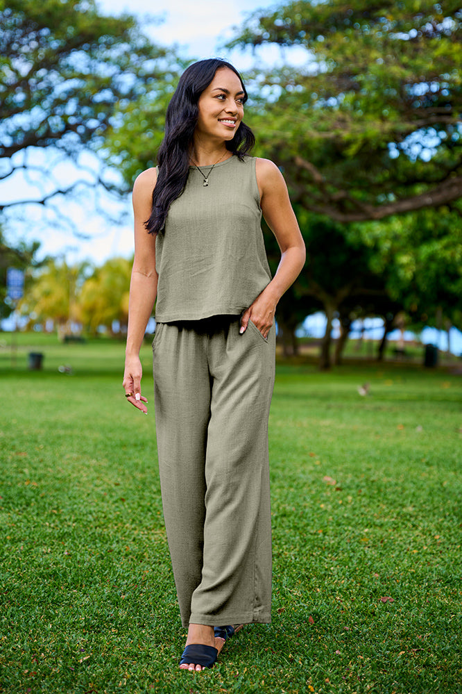 Anything but basic! This wide leg pant drapes nicely and can easily dress up or down. A timeless piece that provides timeless style and comfort. Experience the luxurious drape of this soft rayon-linen fabric, designed to move gracefully and fluidly. Ideal to elevate your wardrobe with the perfect sophisticated touch. Don't forget to pair it up with our Marina tank to add an elegant flair to the ensemble!