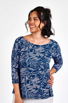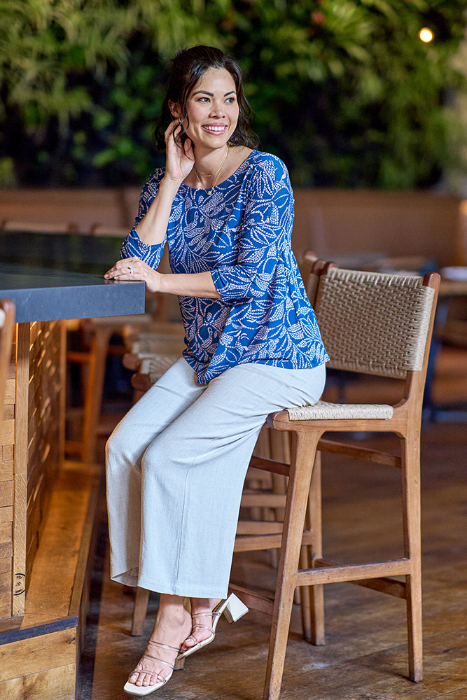 Discover the perfect mix of ease and elegance with our 3/4 Sleeve Trapeze Top, adorned with a one-of-a-kind Shibori leaves print that fuses Asian-inspired patterns and tropical vibes. Now available in a stunning sapphire shade with playful lavender dots, this top is your go-to for bustling days or chill weekends. Its timeless design brings out your confident, laid-back island spirit, making it a standout addition to your closet.