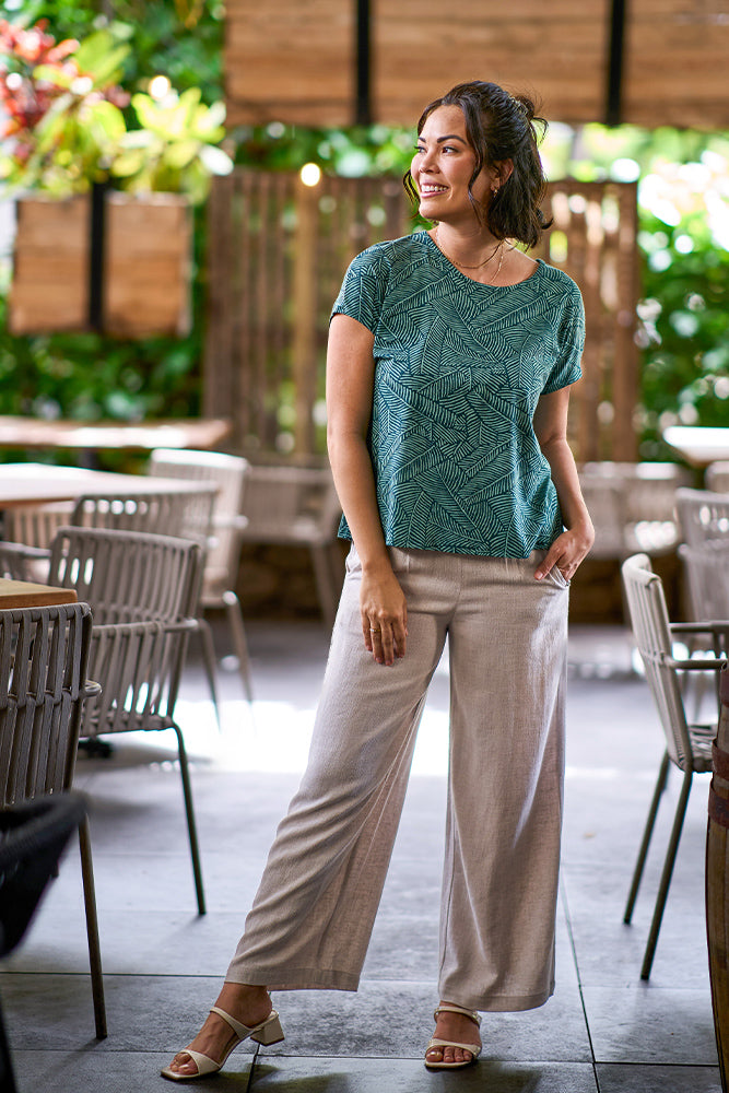 The relaxed tee is here again to offer you comfort, style, and effortless chic wherever your adventures lead. Perfect for packing on a weekend escape or dressing up with statement jewelry for a bold look from office to evening. Its versatile design beautifully captures the essence of island living, making it a favorite and reliable for any occasion.
