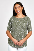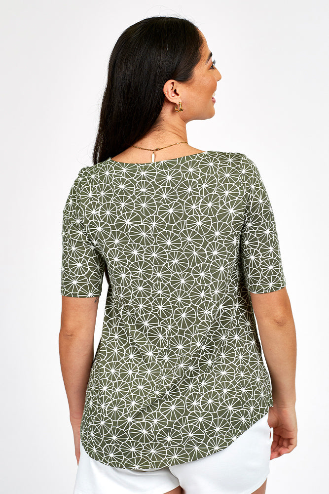 The Elbow Sleeve Top is one of those pieces that just fits perfectly into your wardrobe. The thoughtful elbow-length sleeves and gentle flare create a silhouette that flatters every body beautifully. Now in our hand painted Opihi print rendered in olive green, it's the top that combines comfort with effortless style. Go ahead and let this new print bring the oceans flow right into your closet.