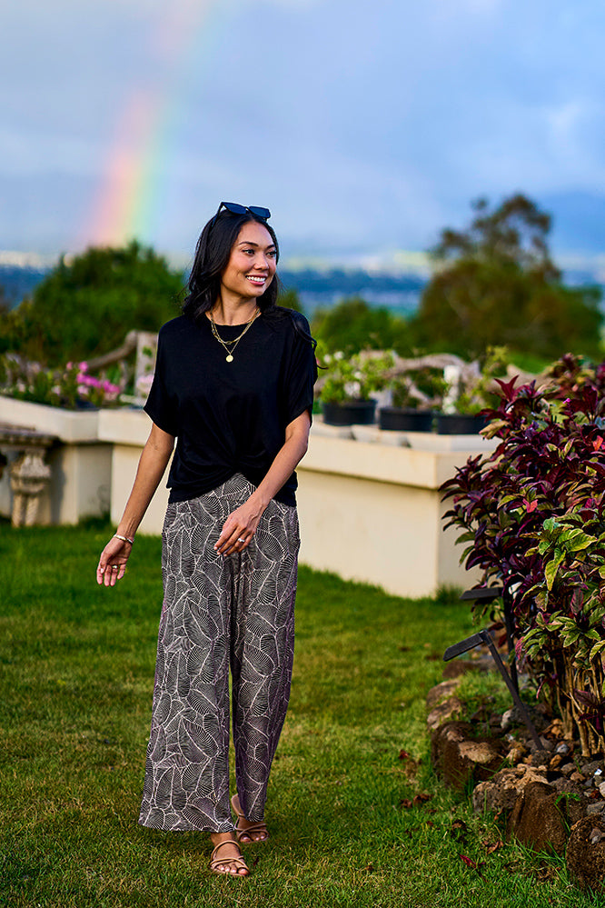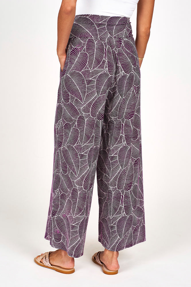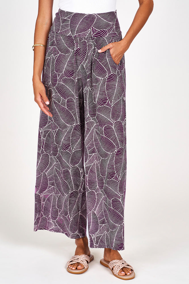 Add to your stylish wardrobe with our Wide Leg Ankle Pant, showcasing the beloved Geo Leaf print. The deep purple shade adds a touch of royalty to your outfit. Designed for both comfort and style, these pants feature an easy, no-fuss waistband and a trendy wide-leg silhouette. Perfectly versatile, they take you seamlessly from a lively brunch in Kahala to a romantic night out in Kapolei. Available in regular and petite sizes to fit you just right!