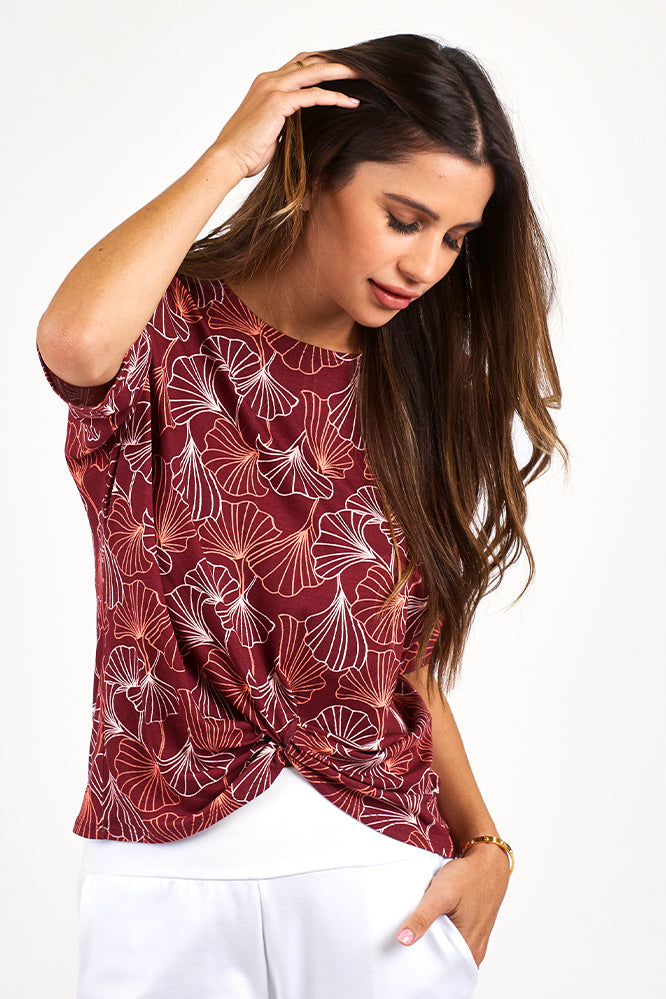 Introducing our Breezy Knot Top, the perfect piece to effortlessly elevate your style. With its relaxed and easy fit, this top is both comfortable and chic. The beautiful Gingko print adds a touch of sophistication, making it ideal for any occasion. Complete your outfit with ease and look put together all day long.