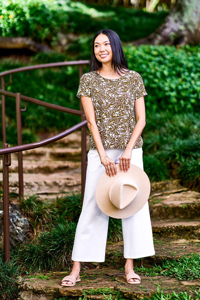 Enhance your closet with our Slit Back Tee, a beloved choice amongst customers. This sophisticated and versatile tee elegantly complements an array of bottoms, a must-have for fashion connoisseurs. Don't let this fashion staple slip away. The monarch print in citron is a blend of abstract and natural elements, bringing a touch of luxury to your wardrobe.