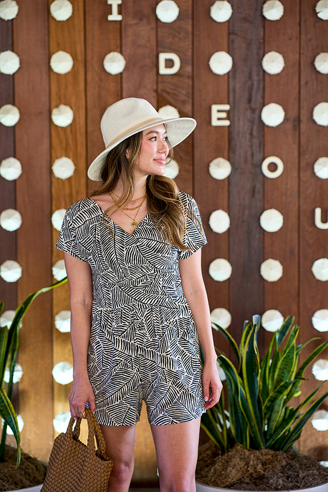 Add some flair to your wardrobe with the must-have surplice romper! Its one-of-a-kind design seamlessly blends comfort and style, making it the perfect transition piece from day to night. And with the playful royal palm print, you'll feel like royalty all day long.