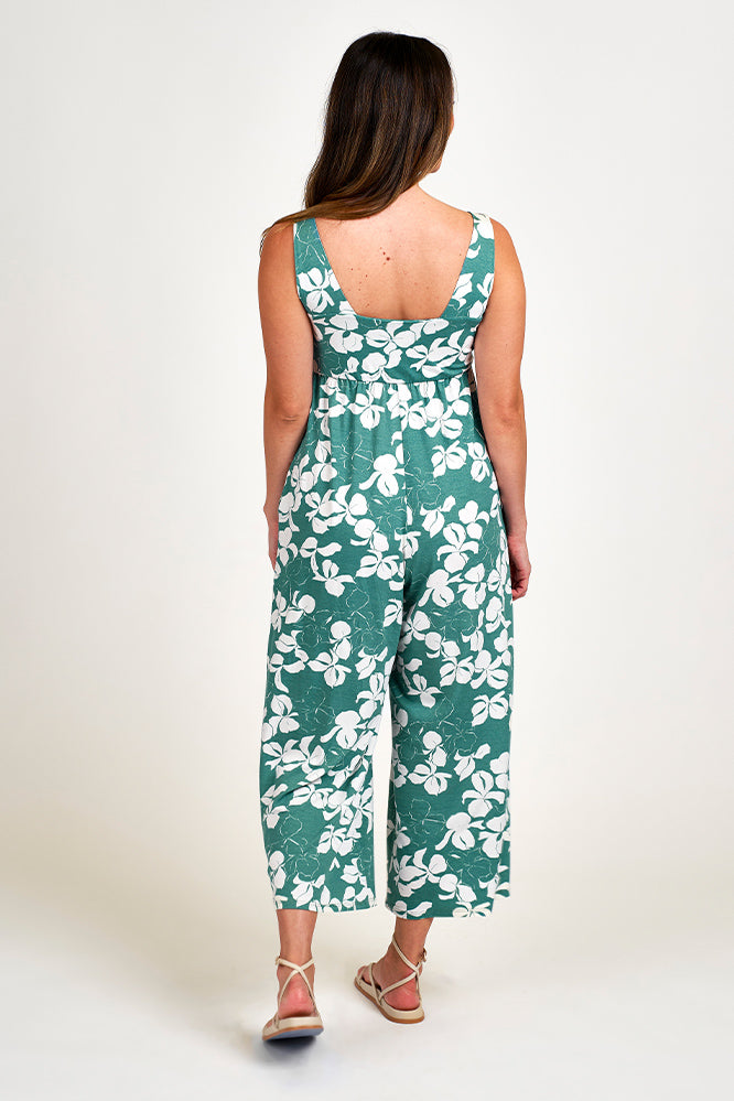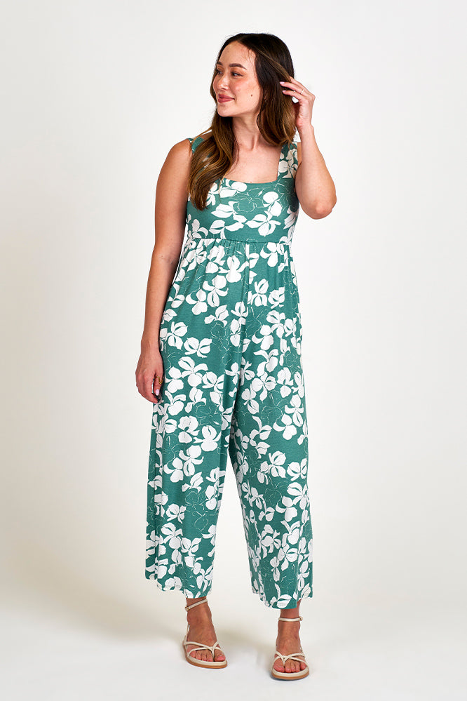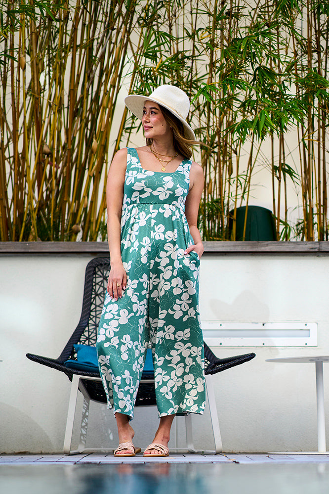 Enhance your wardrobe with our essential Weekend Jumpsuit. This versatile, effortless piece is ideal for any occasion. Elevate your style with a variety of accessories, such as belts, hats, and cardigans. And remember, it also features handy pockets. Admire the stunning orchid print in a rich eucalyptus green hue. Don't miss out on adding this must-have item to your collection!