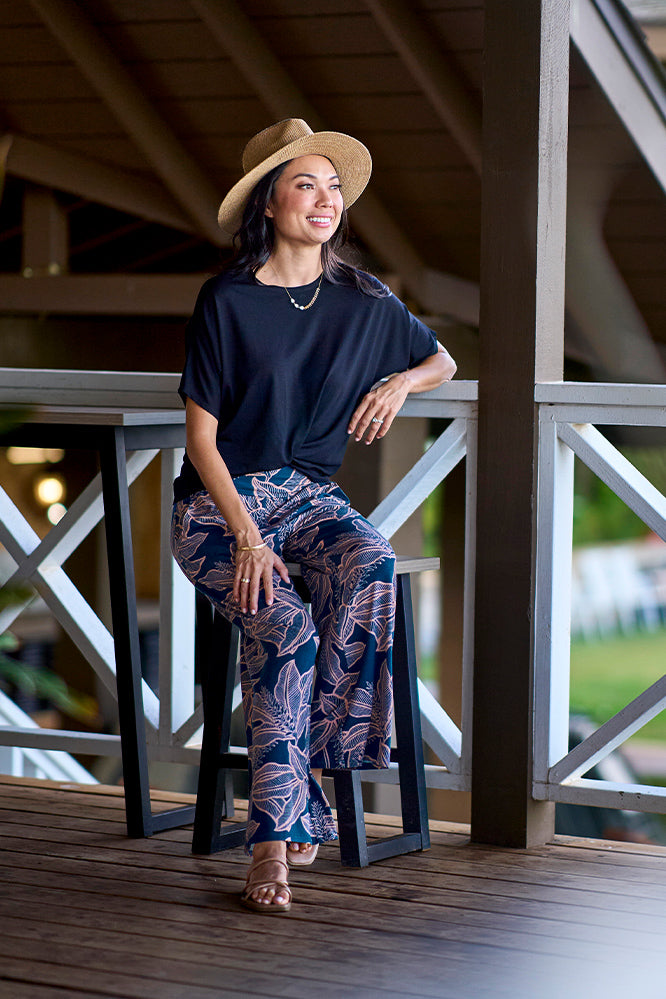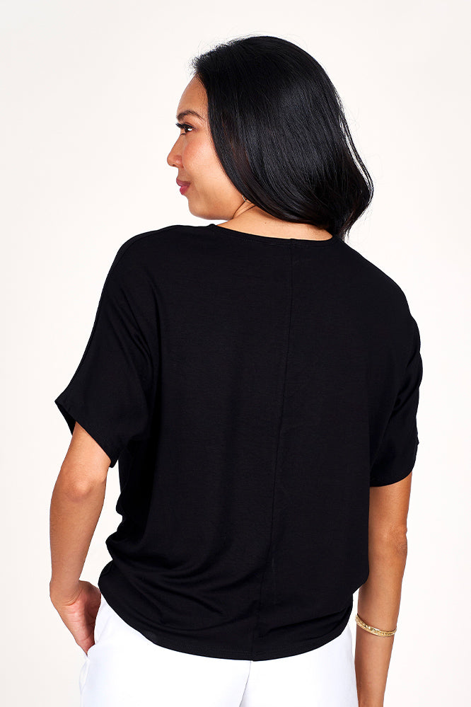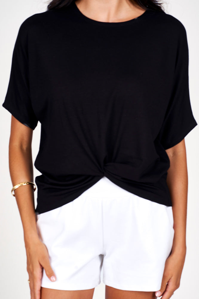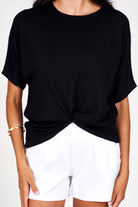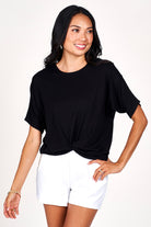 Give your wardrobe a fresh twist with our Breezy Knot Top. Featuring a stylish built-in knot, it offers an easy, fashionable look without any fuss. Its loose fit ensures comfort and freedom of movement, perfect for pairing with shorts, pants, or skirts. This isn’t just any basic tee—it comes in sleek black for that effortlessly cool and polished vibe you’ll love!