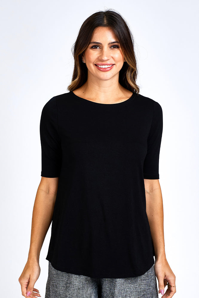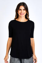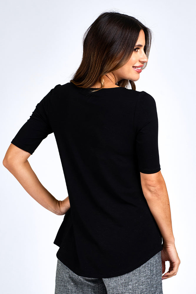 Ready for a wardrobe game-changer? Say hello to our fun and fabulous elbow sleeve top! This little wonder works magic with its oh-so-perfect silhouette that plays well with everything in your closet. The classic black color is basically your outfit's BFF, ready to mix and match with absolutely everything. Snag this versatile cutie before your closet starts giving you the silent treatment!