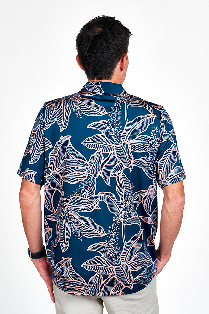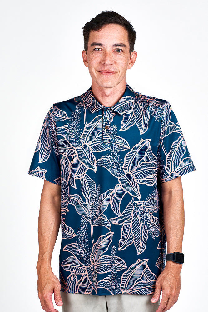 Discover our new men's polo in a classic fit, crafted to combine style and comfort perfectly with our brand’s vibe. Featuring moisture-wicking fabric and UV 50+ protection in the eye-catching torch ginger print with a denim peach shade, it’s versatile enough for the office or the golf course. Step out confidently, whether closing deals or sinking putts, and enjoy a polished, relaxed look every time.
