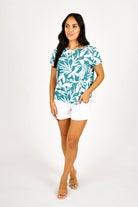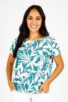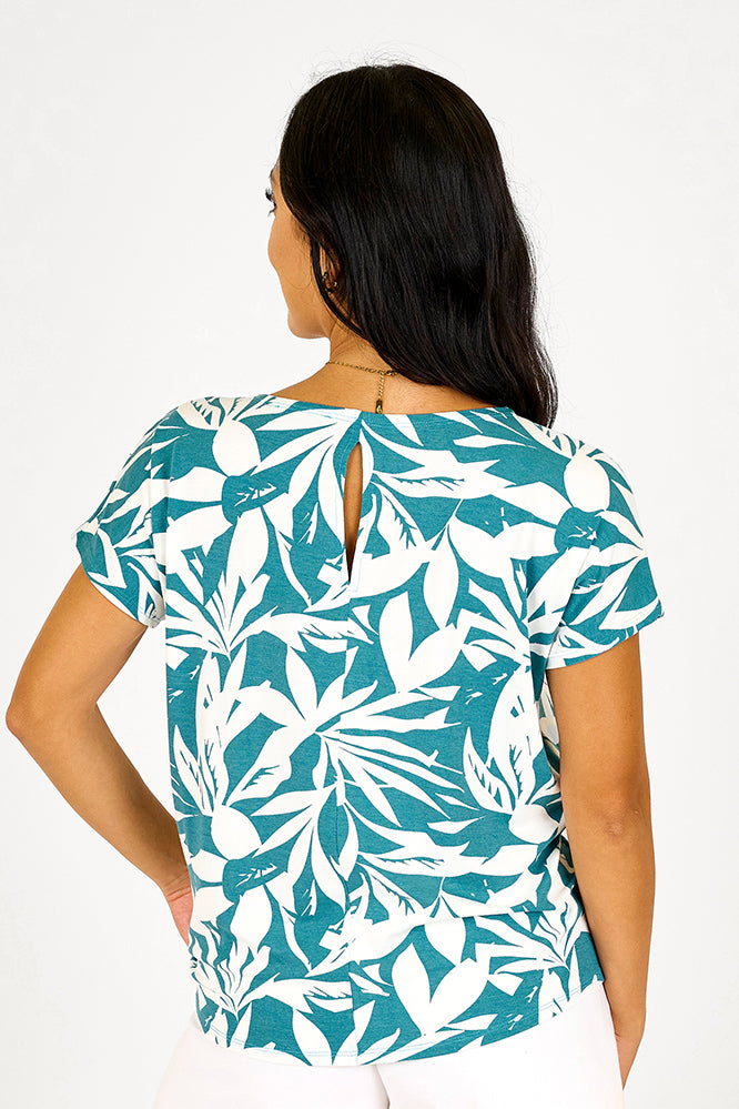 Get ready to add a fun and playful twist to your wardrobe with the aqua modern tropics print slit back tee! You can never have too many slit back tees, and we know this one will quickly become a favorite in your collection. Perfect for dressing up or down, this tee pairs effortlessly with a variety of bottoms.