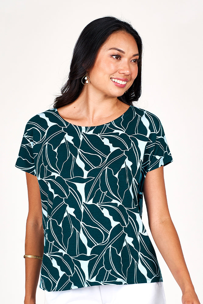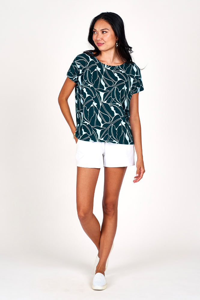 Add a fun and playful twist to your wardrobe with the Slit Back Tee featuring the vibrant Lush Palm print. This tee is designed to be your go-to piece for both casual and dressier occasions, effortlessly pairing with everything from out poolside shorts to our sea breeze pants. The stylish slit back detail adds a unique flair keeping you cool and comfortable throughout the day. Its flattering fit make it easy to layer or wear on its own, bringing a fresh, tropical vibe to your everyday style. Whether you're out to run errands in style or a sunset stroll, this tee adds a lively touch to any outfit.
