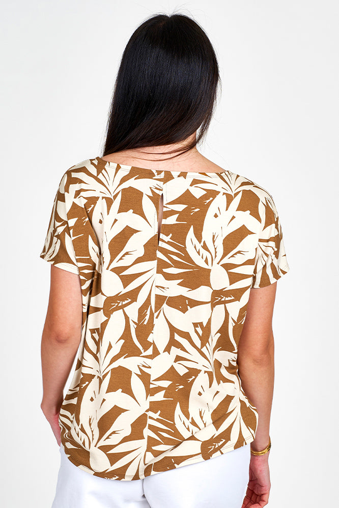 The slit back tee returns in a stunning amber shade, featuring the beloved modern tropics print. With a relaxed drop shoulder and cozy fit, it’s perfect for dressing up or down with endless styling possibilities. This versatile piece is a must-have addition to your wardrobe.