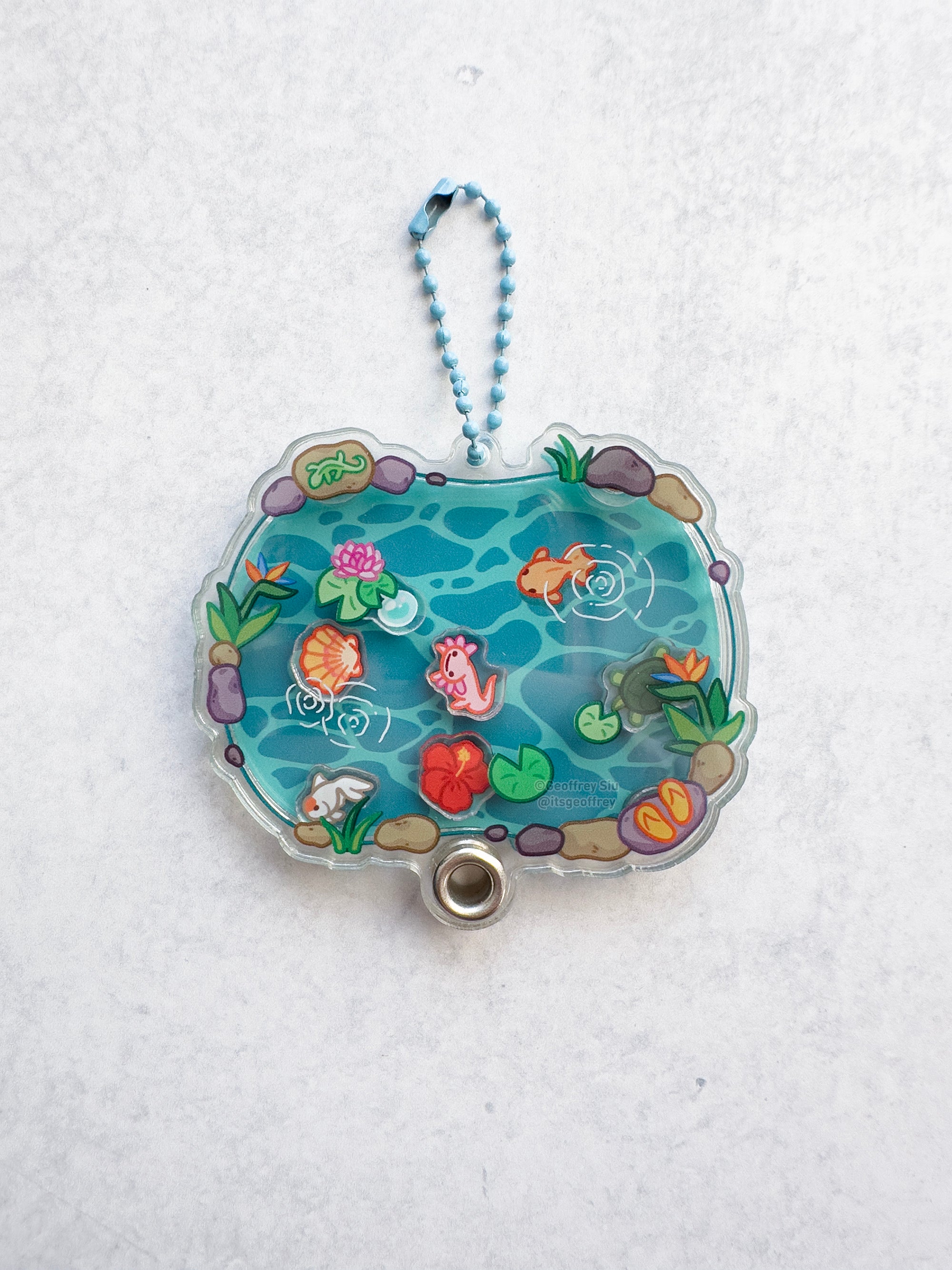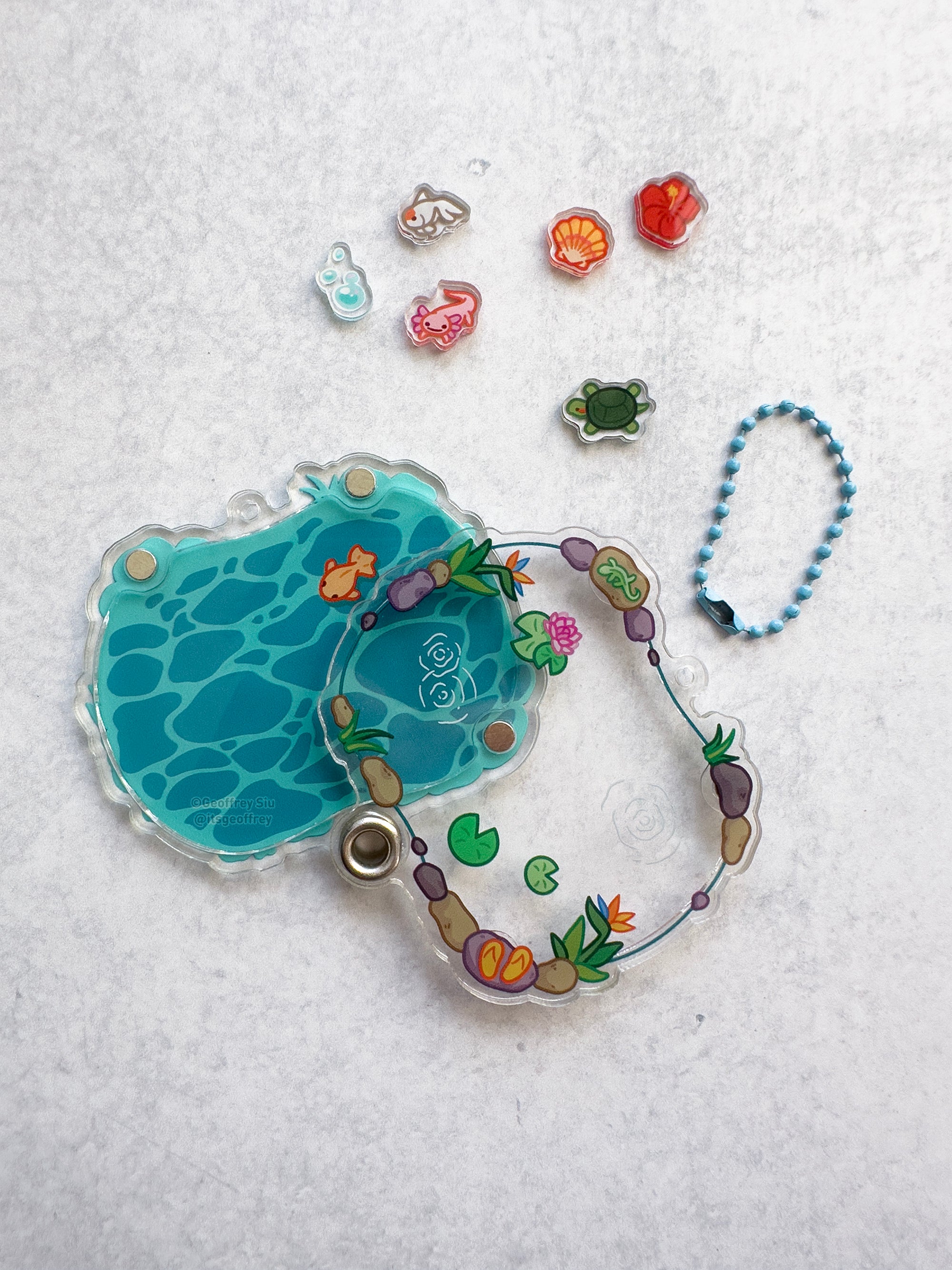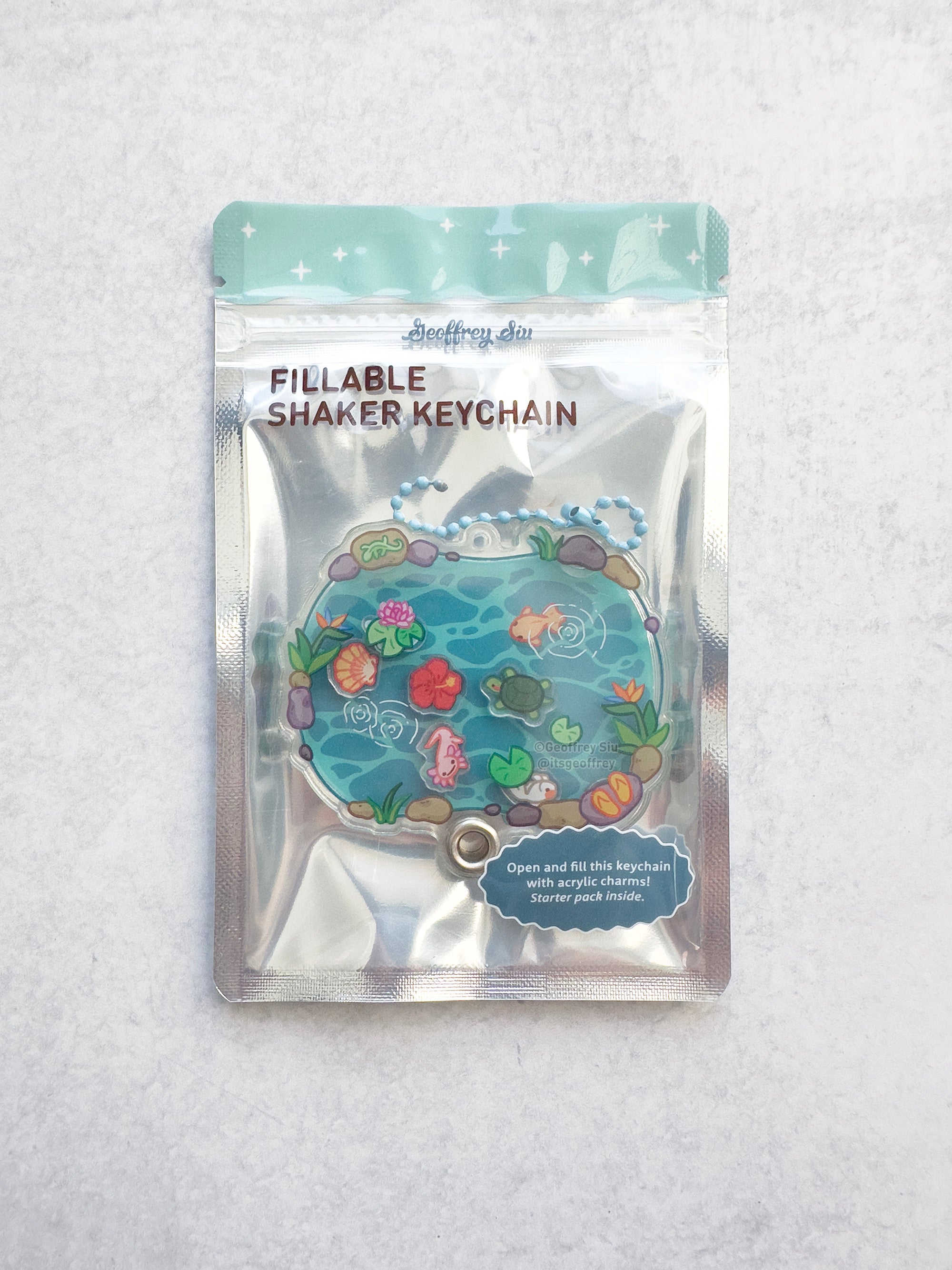 Shaker keychain is fillable and comes with five charms: axolotl, turtle, ranchu goldfish, hibiscus, seashell and bubbles. To fill the keychain, remove the chain and slide the top acrylic off and add your favorite charms. Please peel off the protective plastic before use.