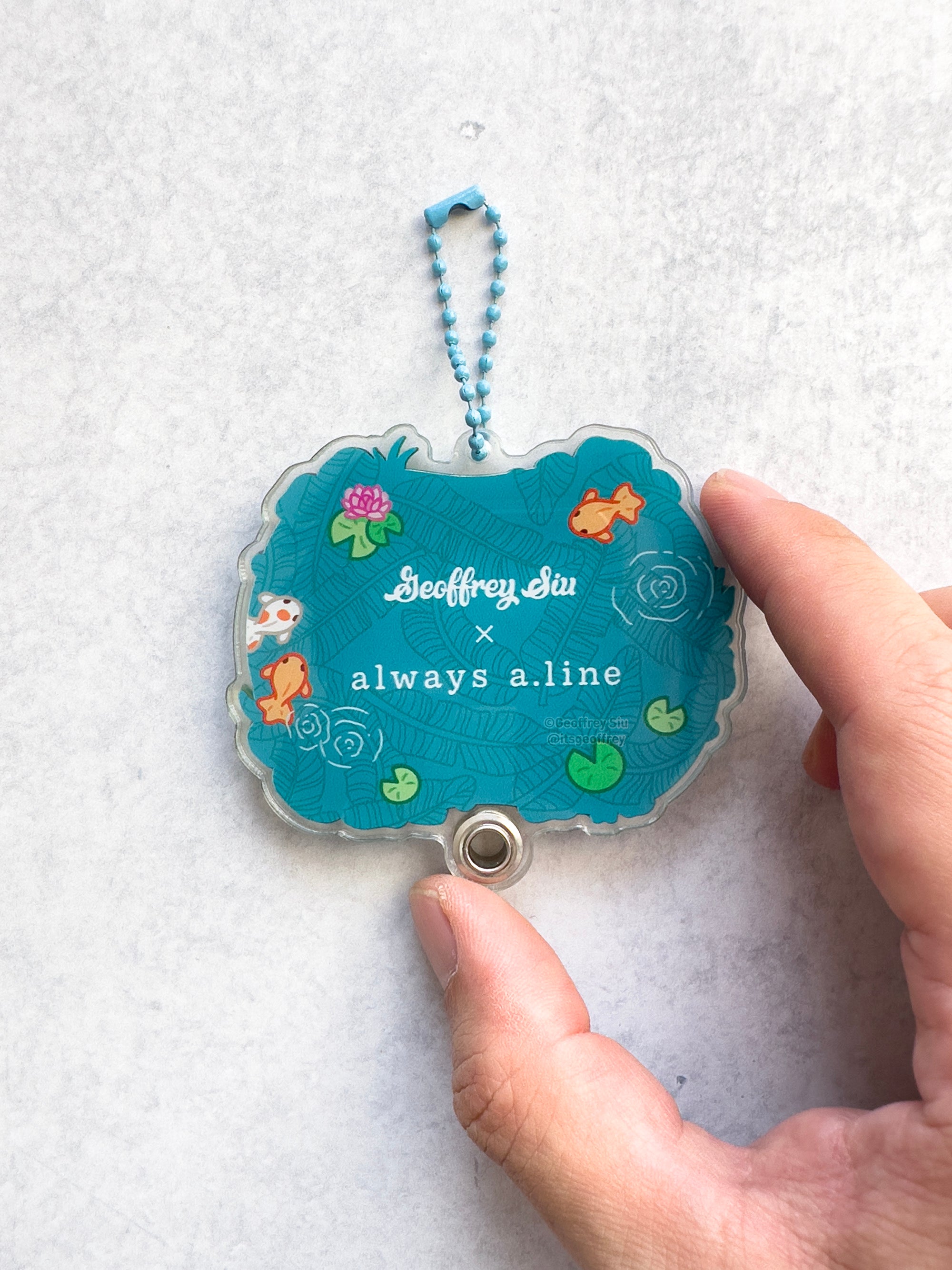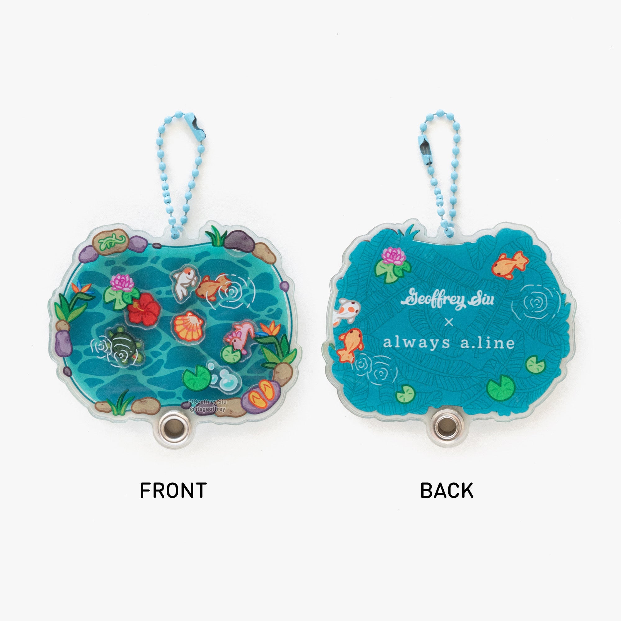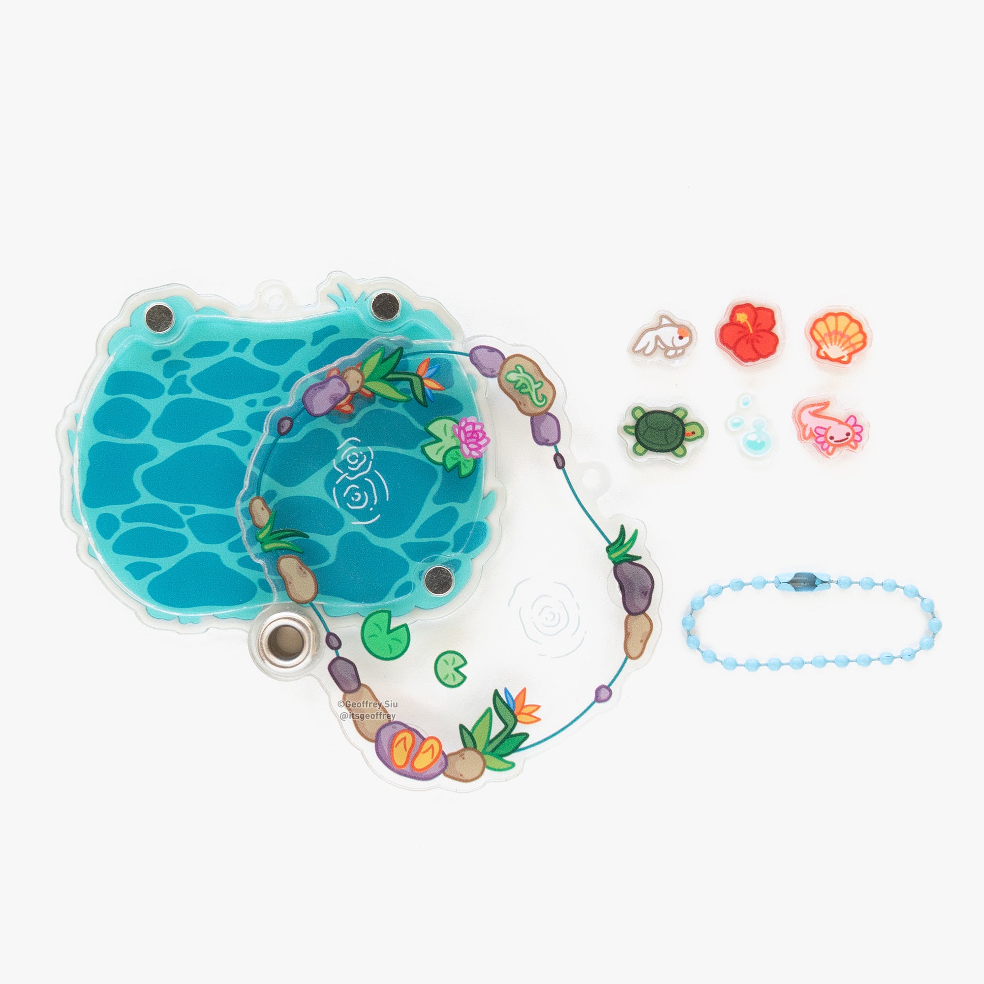Shaker keychain is fillable and comes with five charms: axolotl, turtle, ranchu goldfish, hibiscus, seashell and bubbles. To fill the keychain, remove the chain and slide the top acrylic off and add your favorite charms. Please peel off the protective plastic before use.